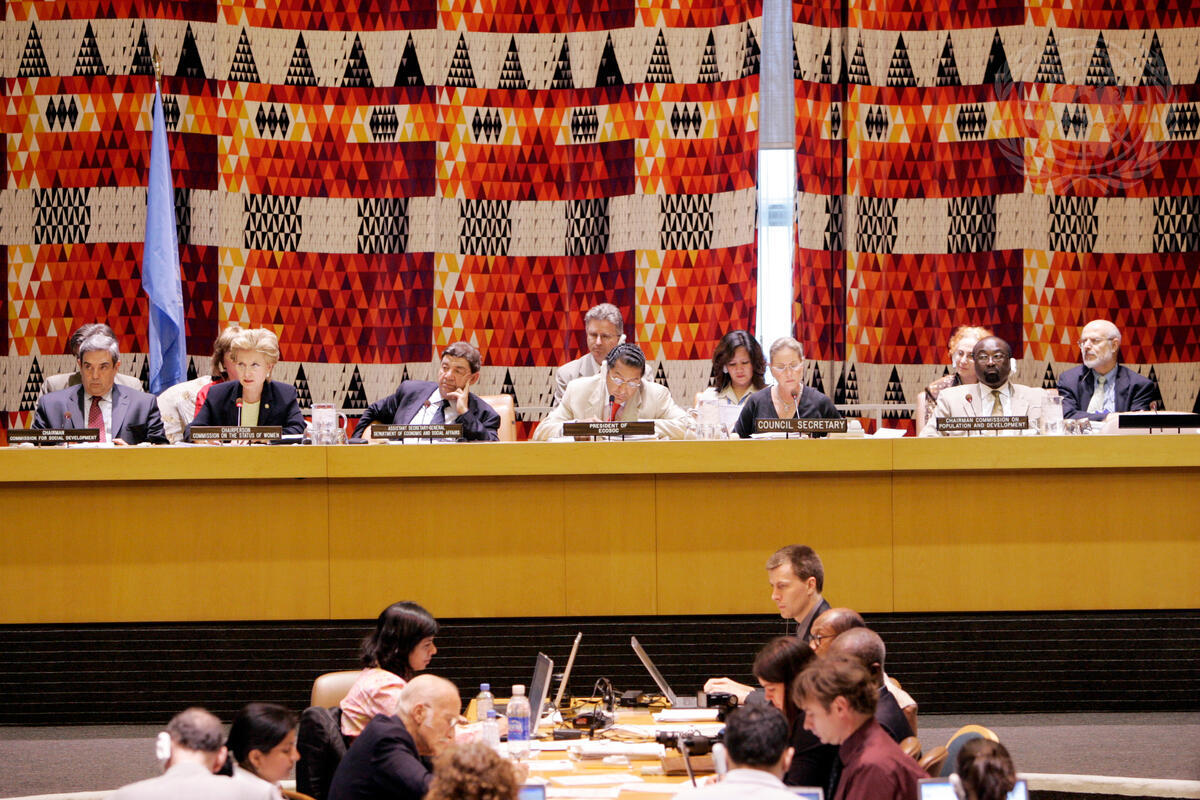 Wide view of participants in the Economic and Social Council (ECOSOC) high-level segment of its 2005 substantive session, today at UN Headquarters. Munir Akram (centre), Permanent Representative of Pakistan to the United Nations and President of the Economic and Social Council (ECOSOC), chairs the meeting.