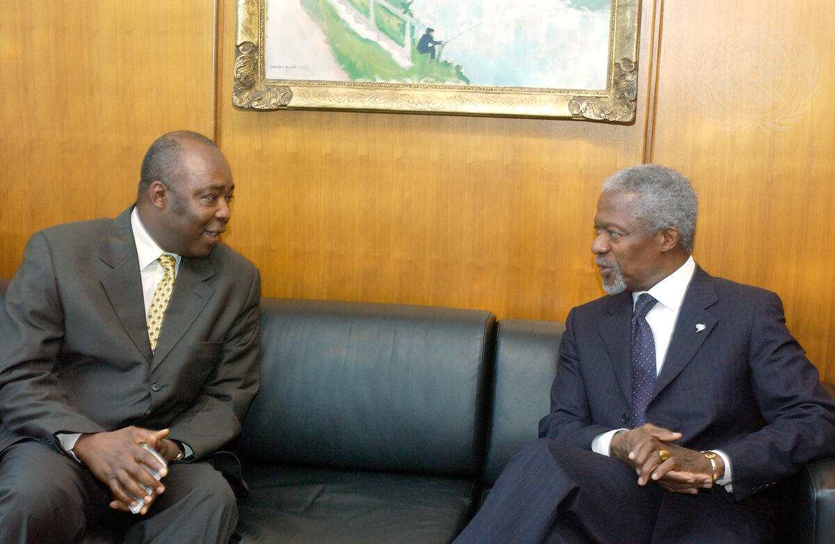 Secretary-General Kofi Annan (right) meets with Abou Moussa, Deputy Special Representative of the Secretary-General for Relief, Recovery and Rehabilitation and UN Humanitarian Coordinator for Liberia, today at UN Headquarters.