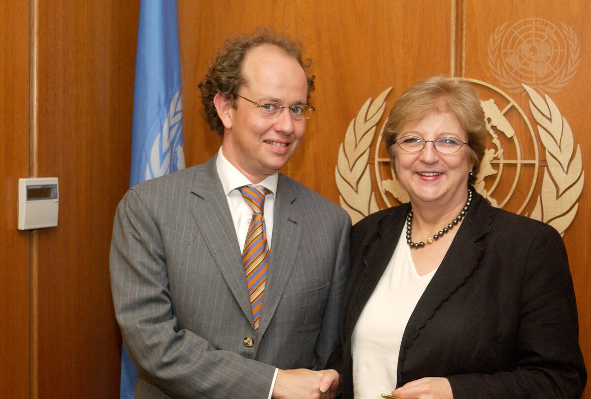 Deputy Secretary-General Louise Fréchette (right) meets with Jean-Louis Schlitz, Minister of Cooperation for Development and Humanitarian Action of Luxembourg, today at UN Headquarters .
