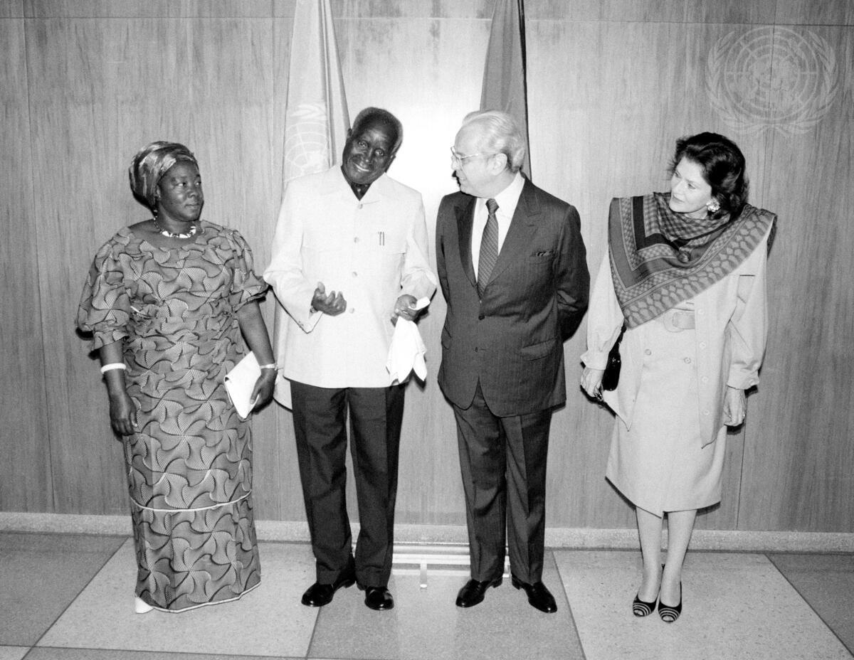 UN Secretary-General Javier PEREZ de CUELLAR (second from right) and his wife, Marcela (right), talking with Kenneth D. KAUNDA, President of Zambia, and his wife Betty, during a photo opportunity today at UN Headquarters.