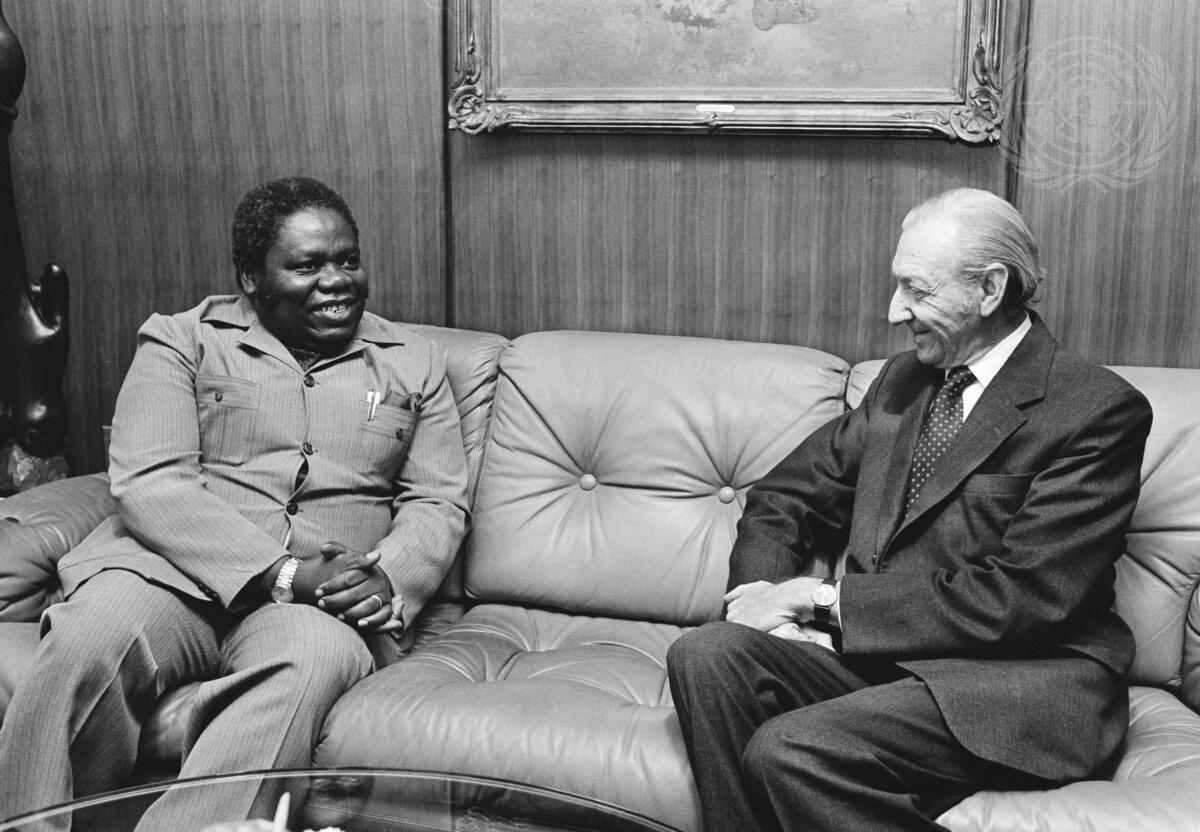 Secretary-General Kurt Waldheim (right) today met with the Minister for Foreign Affairs of Zambia, Wilson M. Chakulya, at the United Nations. The Minister is here to attend the 35th regular session of the General Assembly.