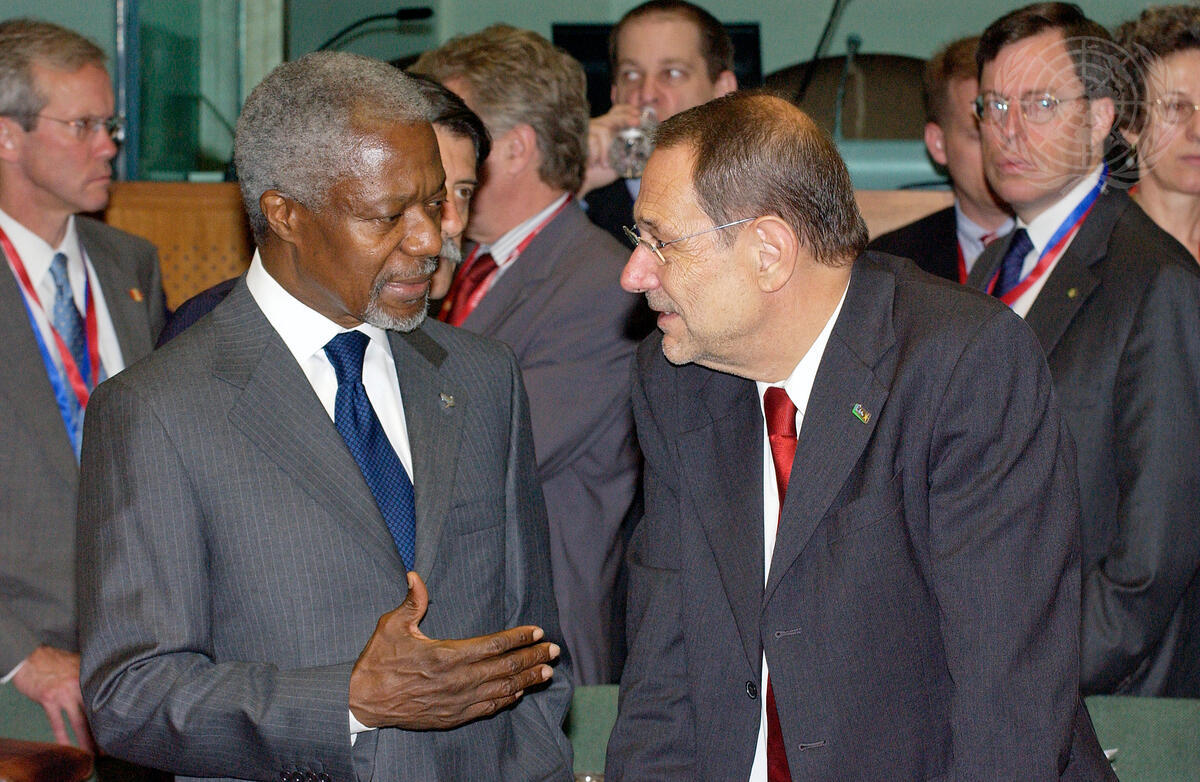 Secretary-General Kofi Annan (left) talks to Javier Solana, High Representative of the European Union for Common, Foreign and Security Policy; at the opening of the international conference on Iraq today in the Belgian capital, Brussels.