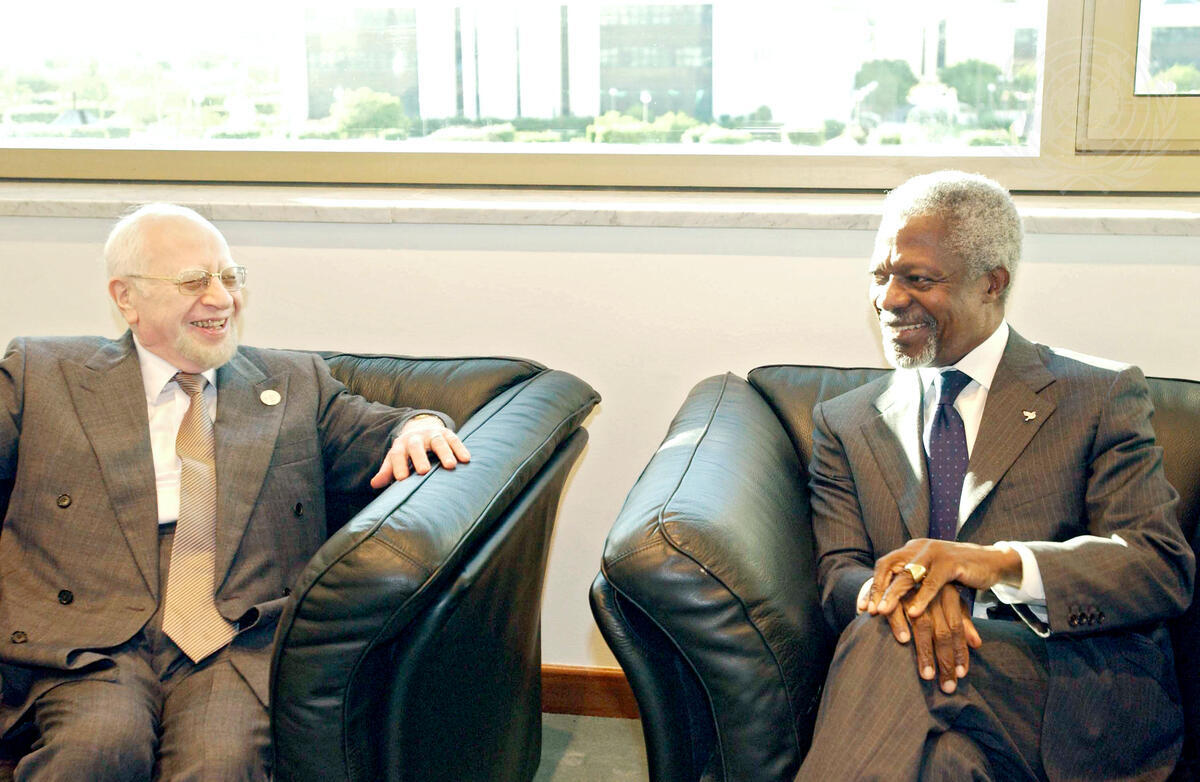 Secretary-General Kofi Annan (right) meets with Mohamed Bedjaoui, Foreign Minister of Algeria, today in Sirte, Libya, where both are attending the assembly of the African Union.