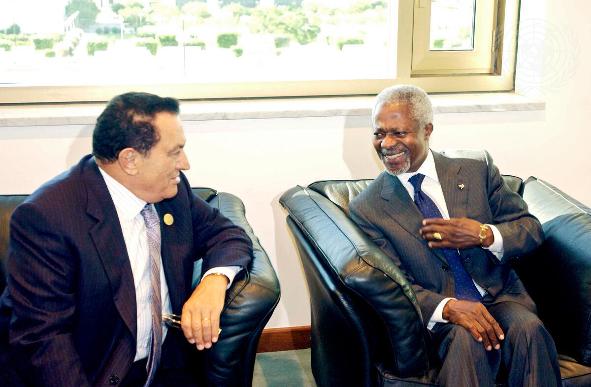 Secretary-General Kofi Annan (right) meets with Mohamed Hosni Mubarak, President of Egypt, today in Sirte, Libya, where both are attending the assembly of the African Union.