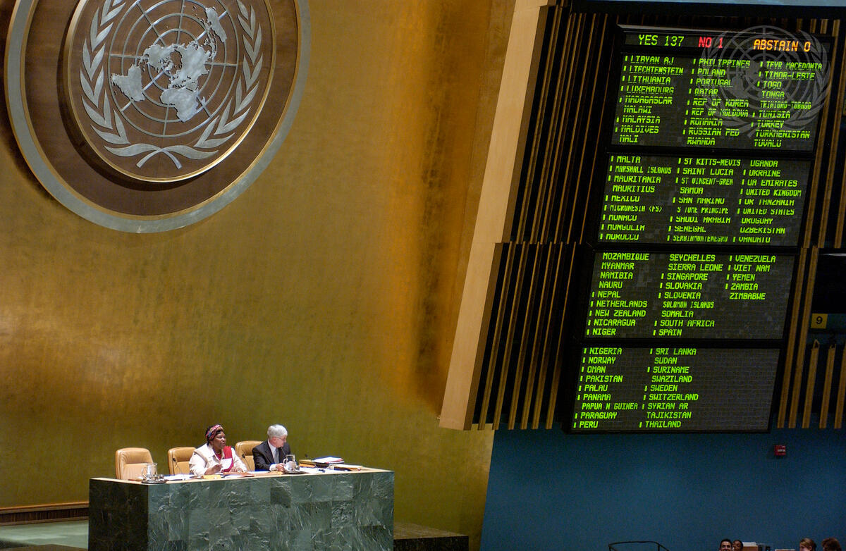 Wide view of the General Assembly shows the results of the vote by that body to adopt a resolution by a recorded vote of 137 in favour to 1 against (Democratic People's Republic of Korea) with no abstentions, and to endorse its strong support for the Nobel Peace Prize-winning work of the International Atomic Energy Agency (IAEA) and Director General Mohamed ElBaradei, today at UN Headquarters. The Assembly also reaffirmed its strong support of the Agency in the area of technology transfer to developing countries and in nuclear safety, verification and security.