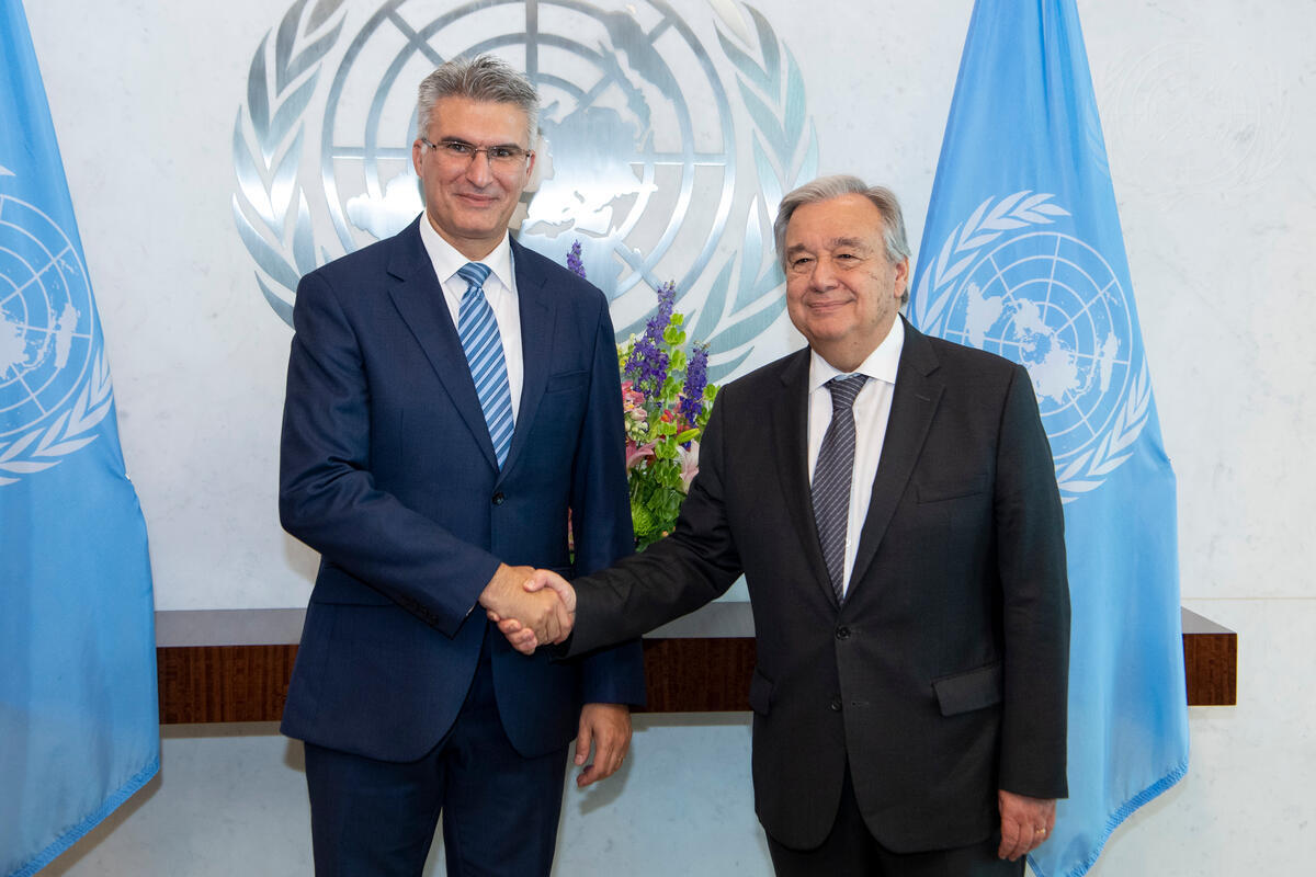 Secretary-General António Guterres (right) meets with Carmelo Abela, Minister for Foreign Affairs and Trade of the Republic of Malta.