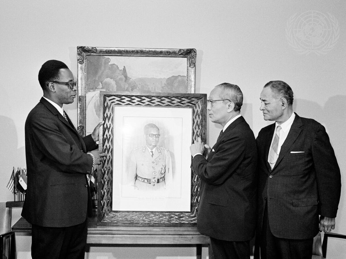 President Mobutu presented Secretary-General, U Thant with a portrait of himself. At the right is Dr. Ralph J. Bunche, Under-Secretary-General for Special Political Affairs.