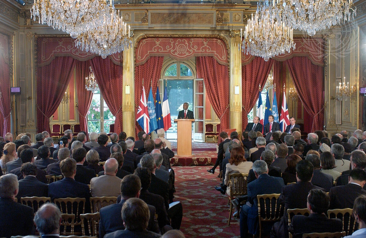 Secretary-General Kofi Annan (centre) addresses a Global Compact event entitled ""The Business Contribution to the Millennium Development Goals"" at the Palais de I'Elysée today. Speakers also included, from left to right, seated: Jacques Chirac, President of France; Tony Blair, Prime Minister of the United Kingdom; and Bertrand Collomb, Chairman of Lafarge.