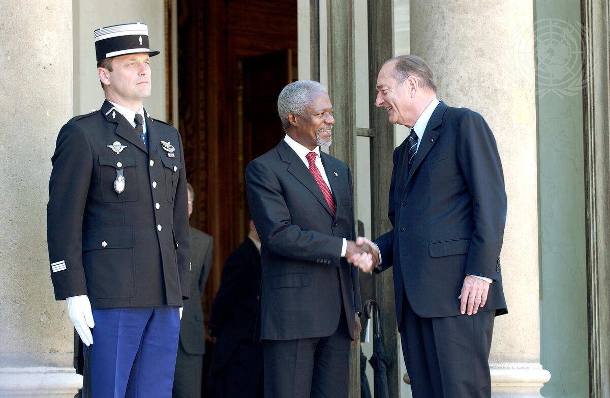 Secretary-General Kofi Annan (center) is greeted by Jacques Chirac, President of France, today in Paris.