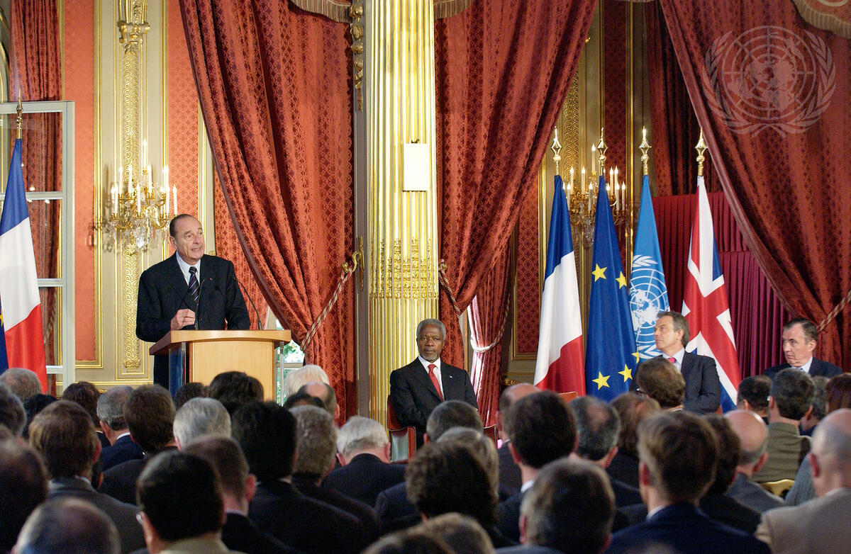 Secretary-General Kofi Annan (second from left) listens as Jacques Chirac, President of France, addresses a Global Compact event entitled ""The Business Contribution to the Millennium Development Goals"" at the Palais de I'Elysée today. Speakers also included Tony Blair (next to Mr. Annan), Prime Minister of the United Kingdom, and Bertrand Collomb (seated, right), Chairman of Lafarge.