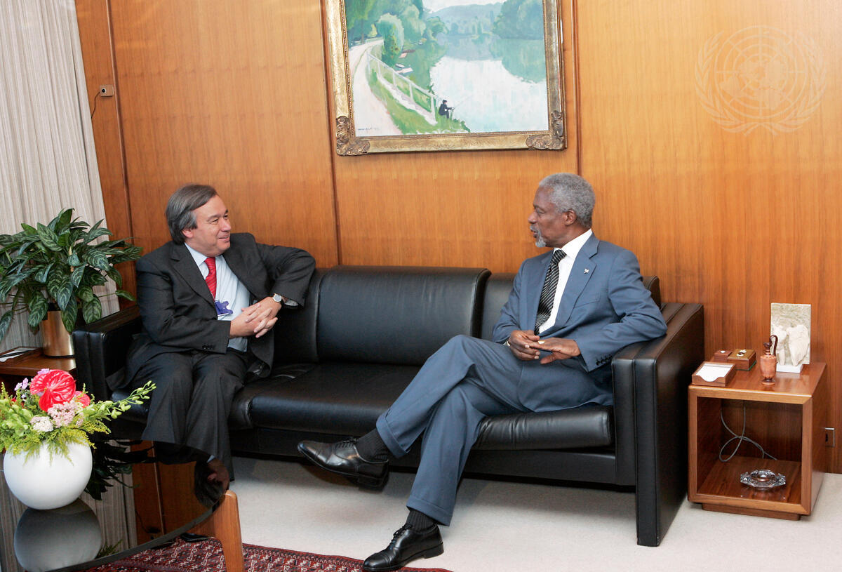 Secretary-General Kofi Annan (right) meets with António Guterres, UN High Commissioner for Refugees (UNHCR), today at UN Headquarters.