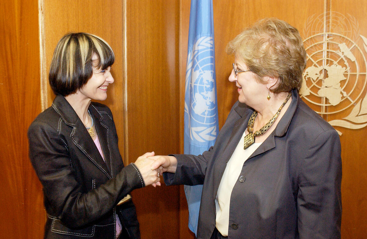 Deputy Secretary-General Louise Fréchette (right) meets with Micheline Calmy-Rey, Minister for Foreign Affairs of Switzerland, today at UN Headquarters.