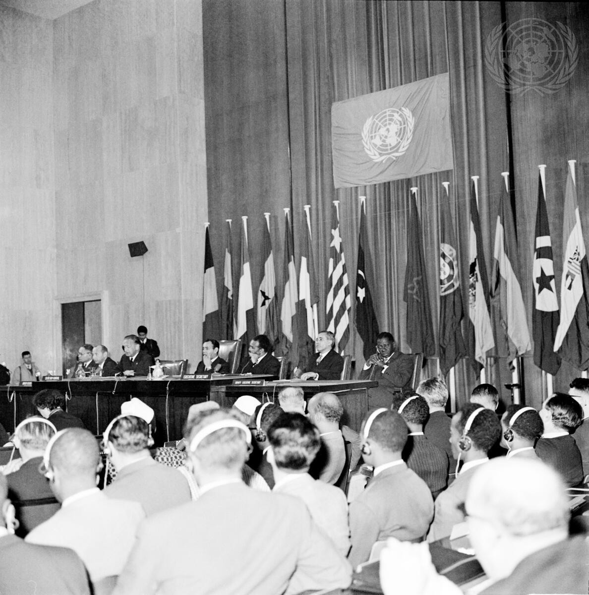 UN Secretary-General Dag Hammarskjöld addresses the meeting. At the table, from left to right, are: Ralph J. Bunche, UN Under-Secretary for Special Political Affairs; Philippe de Seynes, UN Under-Secretary for Economic and Social Affairs; Mr. Hammarskjöld; H.R.H. Moulay El Hassan, Crown Prince of Morocco, Mekki Abbas, ECA Executive Secretary; Abderrahim Bouabid, Minister of Finance and National Economy of Morocco, R.K. Gardiner, ECA Deputy Executive Secretary.