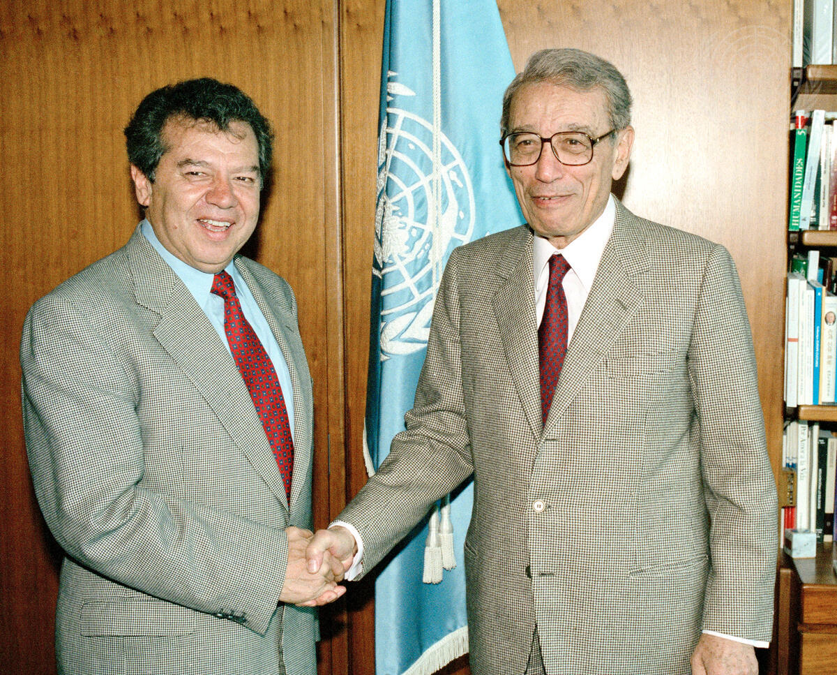 Secretary-General Boutros Boutros -Ghali (right) meets Porfirio Munoz-Ledo, the Chairman of the Party of the Revolutionary Democracy of Mexico.