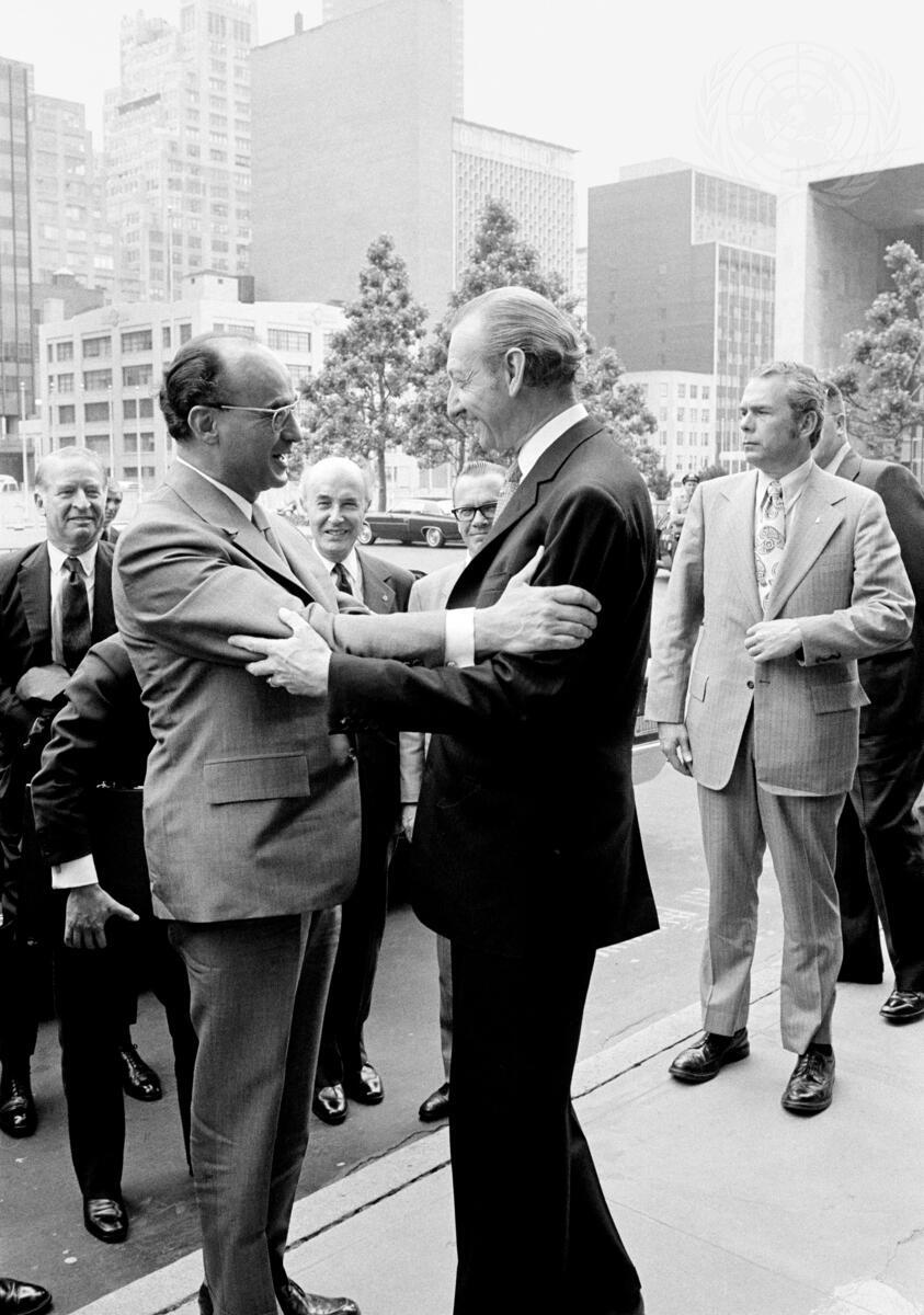 Kurt Waldheim greeting President Luis Echeverria Alvarez at the Secretariat entrance.