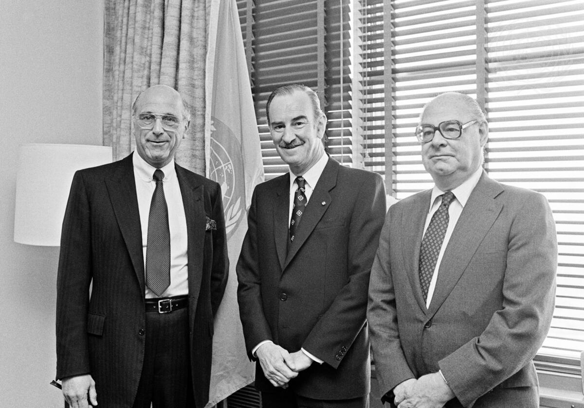 President of the General Assembly Rudiger von Wechmar (FRG), left, meeting in his office today with C.A. van der Klaauw, Minister for Foreign Affairs of the Netherlands. At right is the Netherland's Permanent Representative to the UN, H. Scheltema.