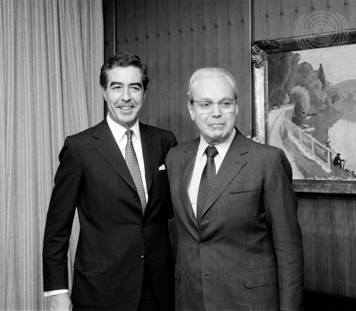 Secretary-General Javier Perez de Cuellar (right) today met at United Nations Headquarters with Bernardo Sepulveda-Amor, Secretary of State for External Affairs of Mexico, who is here to address the International Conference on the relationship between disarmament and development.