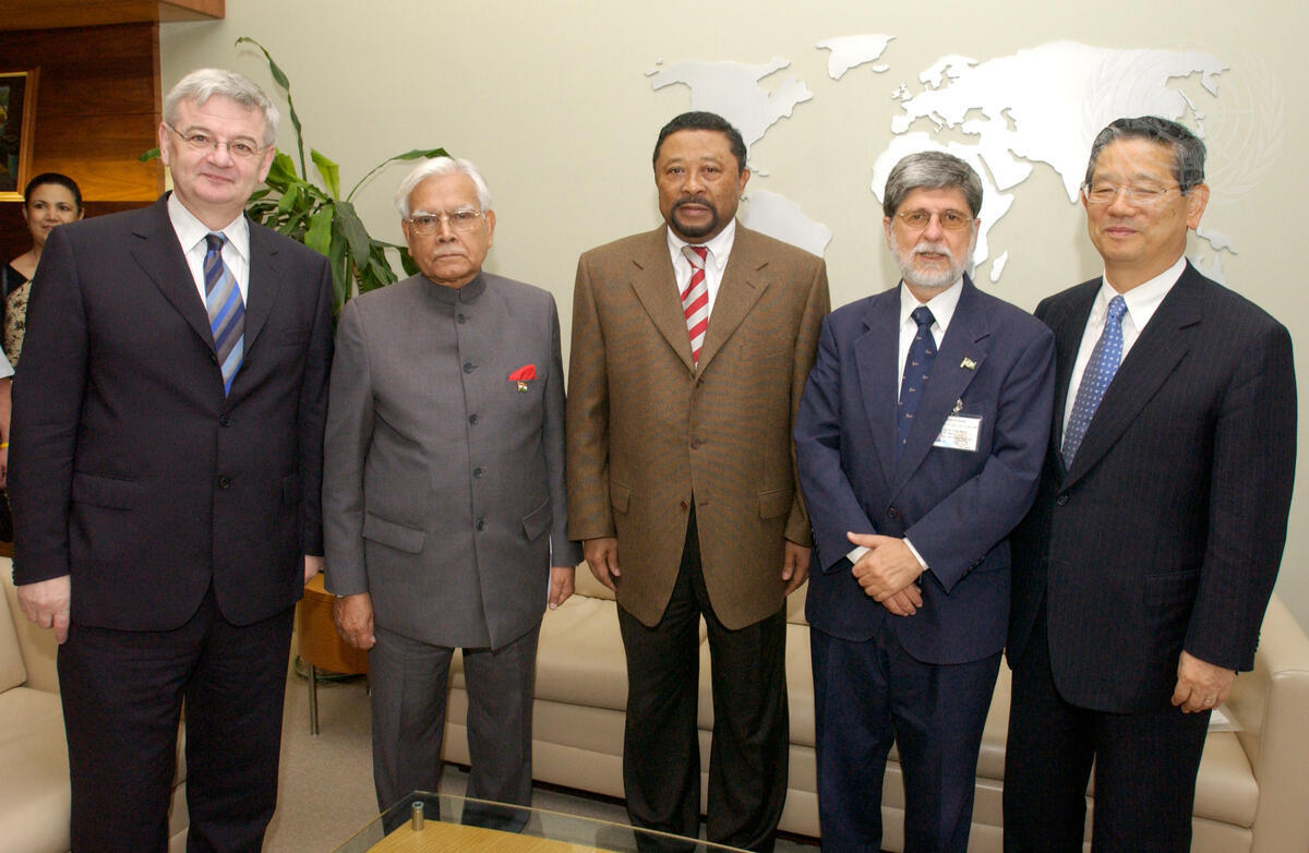 Jean Ping (centre), President of the fifty-ninth session of the General Assembly, met today at UN Headquarters with the Foreign Ministers of the so-called Group of Four (""G4""). Left to right: Joschka Fischer, Foreign Minister of Germany; K. Natwar Singh, Foreign Minister of India; Mr. Ping; Celso Luiz Nunes Amorim, Foreign Minister of Brazil; and Nobutaka Machimura, Foreign Minister of Japan. The ""G4"" refers to Japan, Brazil, Germany and India, all of whom are aspiring to become permanent members of the Security Council.