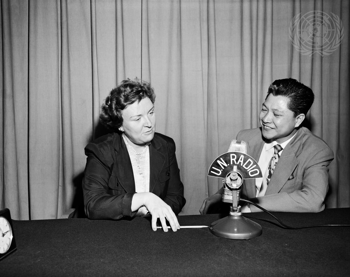 Mr. FRANCISCO TRINIDAD (right), Director of Government Radio, Manila, just arrived from the Philippines and is paying an official visit to UN Headquarters. Here, he is interviewed by Miss MARGUERITE CLARK, Producer of ""UN Album"". Mr. Trinidad has been responsible for relaying the United Nations radio programs over the air in the Philippines daily and for the last four years without a break.