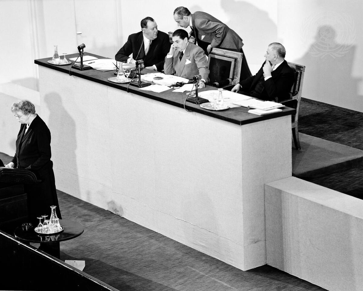 Mrs. Franklin D. ROOSEVELT, U.S.A., is shown here speaking at the rostrum during the last plenary meeting of the U.N. Sixth General Assembly. In the background, sitting, are left to right: Mr. Trygve LIE, Secretary-General, Dr. Luis PADILLA NERVO, Assembly President and Mr. Andrew CORDIER, Assistant to Mr. Lie.