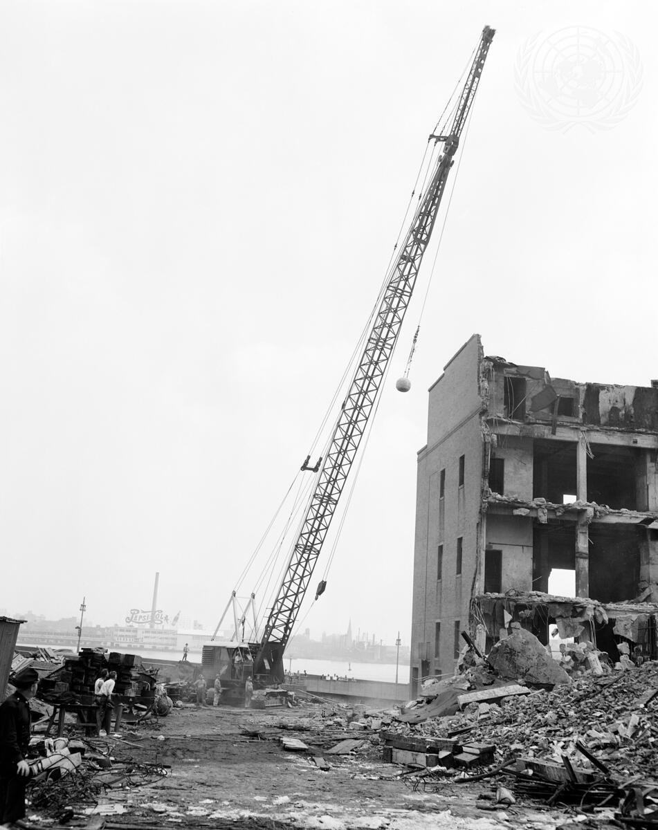 Demolition begins. Cranes and picks go into action as workmen start demolishing buildings on the site. Before this work can be completed, new homes must be found for 51 families housed in two apartment buildings along the northern boundary of the site. The UN purchased four vacant apartment buildings in order to relocate these families.