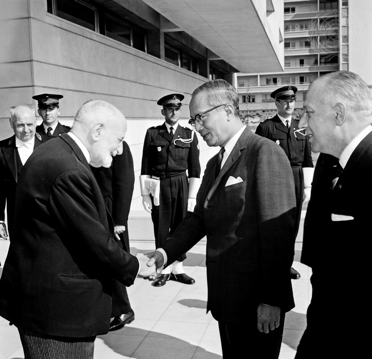 Secretary-General U Thant (centre) is seen being greeted by René Cassin, President of the Human Rights Court, as he arrived at the Palace for Human Rights in Strasbourg, where he was received by representatives of the European Commission of Human Rights.