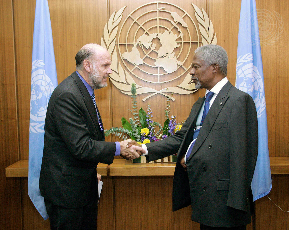 Secretary-General Kofi Annan (right) receives credentials from Alejandro Artucio Rodriguez, the new Permanent Representative of Uruguay to the United Nations, today at UN Headquarters.