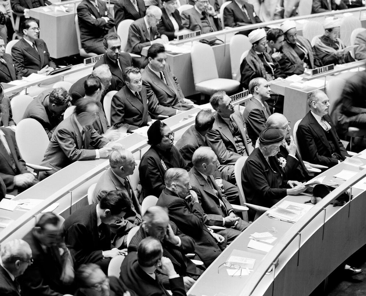 The plenary hall with the delegates at the session's inaugural meeting. In the front row, the delegation of the United States; in the second row, delegates from Yugoslavia and Yemen.