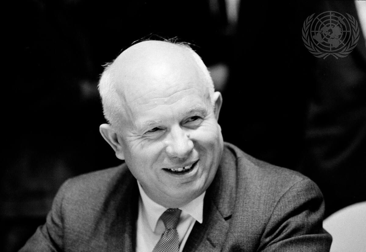 Mr. N.S. Khrushchev, Chairman of the Council of Ministers of the USSR, who is heading his country's delegation, is seen here at the USSR desk waiting for the afternoon meeting to begin.