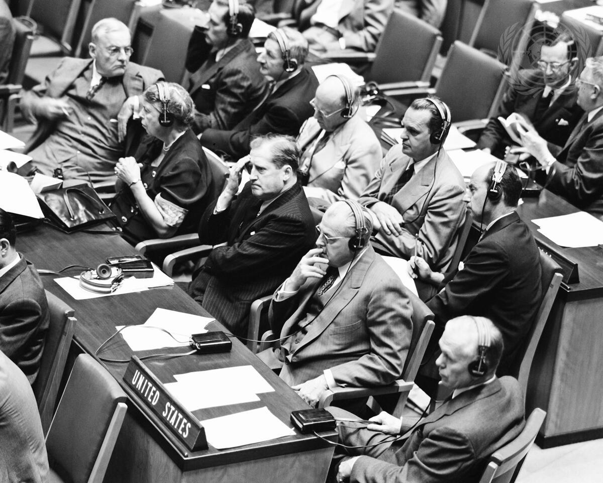 United States delegation seated in Assembly hall during 82nd plenary meeting of second regular session of the United Nations General Assembly. Left to right in front row: John Foster Dulles, representative; Mrs. Franklin D. Roosevelt, representative; Herschel V. Johnson, representative; Warren R. Austin, permanent representative to United Nations and delegation vice-chairman; George C. Marshall, delegation chairman and Assembly Vice-President.