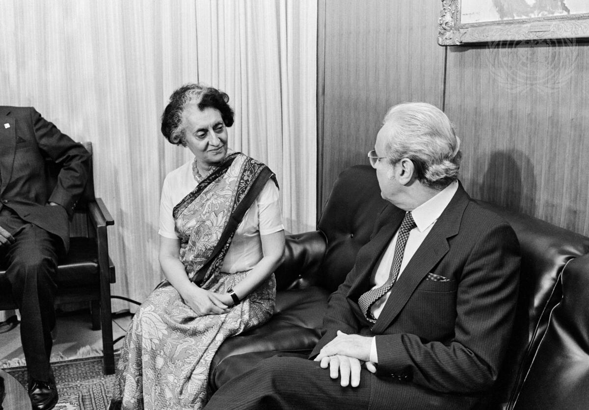 The Prime Minister of India, Indira Gandhi, paid an official visit to United Nations Headquarters on 28 July and conferred with Secretary-General Javier Perez de Cuellar (right).