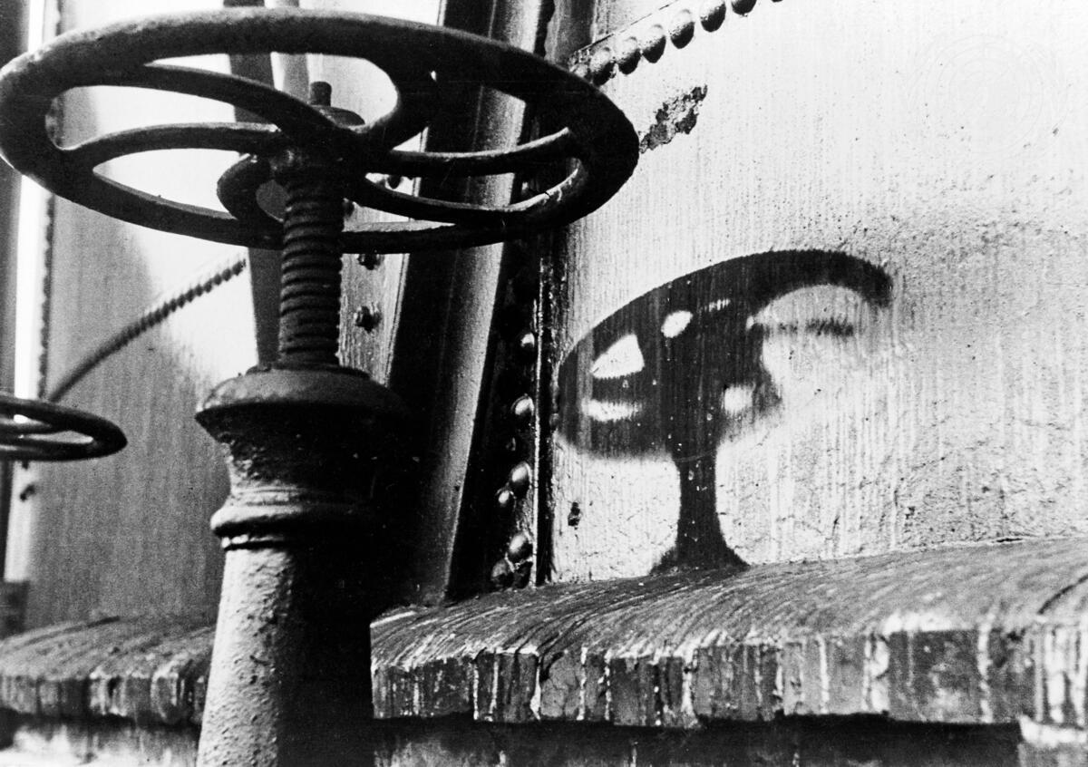 Thermic rays imprint the shadow of a handle on a gasometer about 2 kilometers from the hypocenter at Hiroshima.