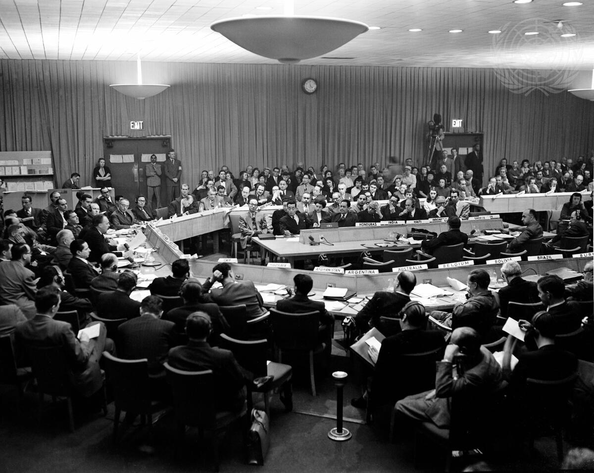 Partial view of the General Assembly's First (Political and Security) Committee meeting held at Lake Success on 25 January 1951. This picture was taken during Sir Gladwyn Jebb's address to the delegates (Sir Gladwyn is at the extreme left).