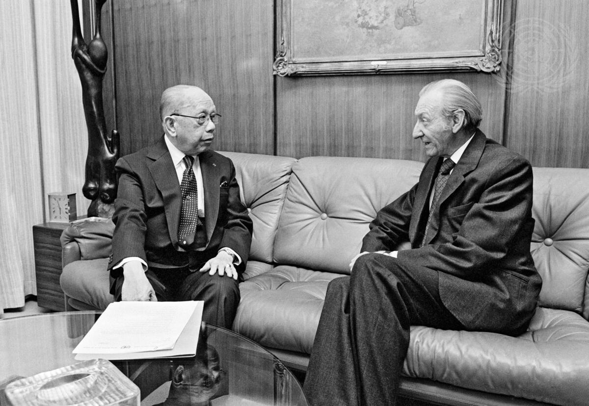 General Carlos P. Romulo, Foreign Minister of the Philippines, (left), conferring today with Secretary-General Kurt Waldheim. While General Romulo came today as Chairman of the Expert Group on the Relationship between Disarmament and International Security, the refugee problem was also an important issue on the agenda for the meeting.