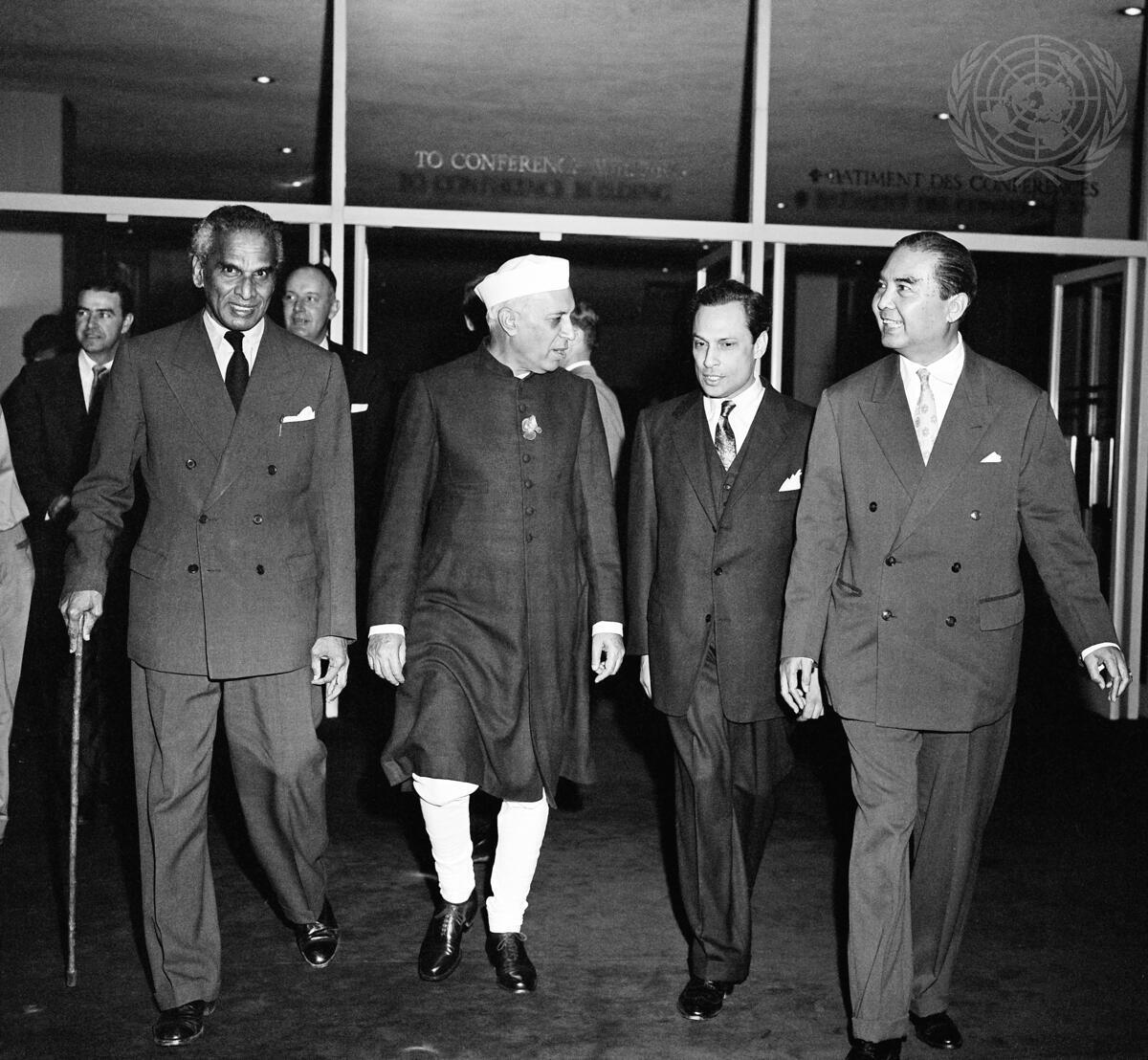 Picture taken upon arrival of the Prime Minister at U.N. Headquarters, from left: Mr. V.K. Krishna Menon, India's representative to the U.N. ; Mr. Nehru; Mr. Arthur S. Lall, India's Permanent Representative to the U.N.; and Prince Wan Waithayakon, of Thailand, President of the General Assembly.
