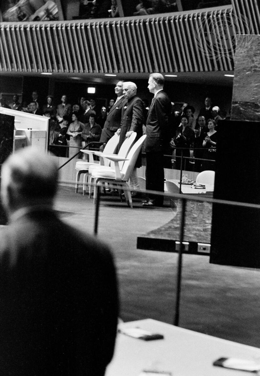 Escorting Mr. Nehru are Prince Wan Waithayakon (left) of Thailand, President of the current session of the General Assembly, and Mr. Dag Hammarskjöld, Secretary-General of the United Nations.
