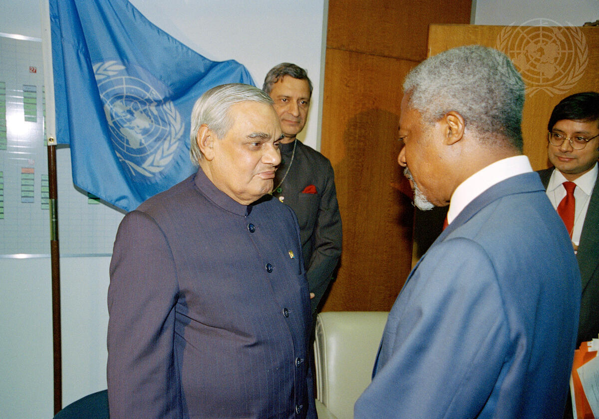 Secretary-General Kofi Annan (right) meets with Atal Behari Vajpayee, Prime Minister of India, at Headquarters to address the Millennium Summit of the United Nations.
