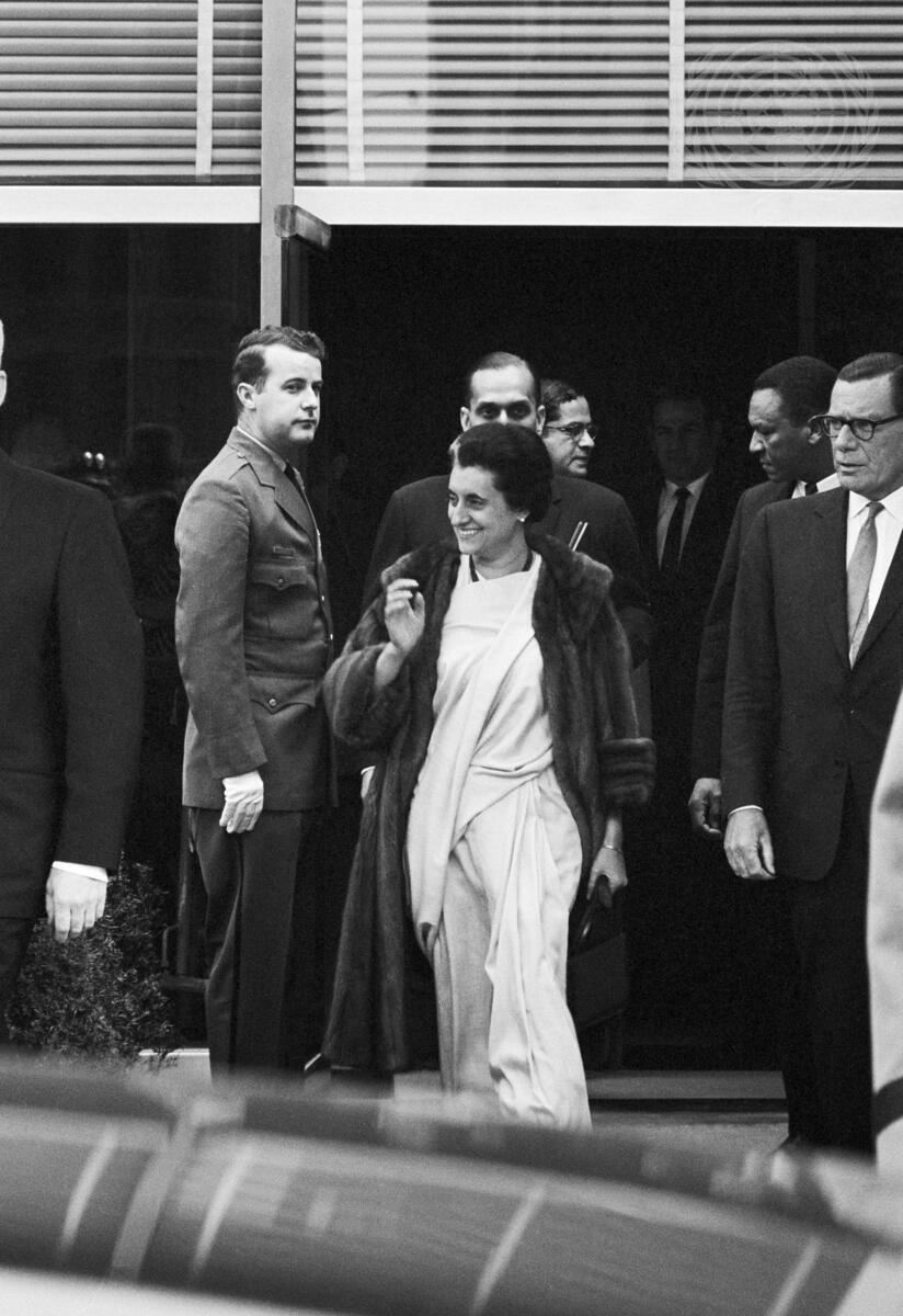 Mrs. GANDHI is seen leaving at the conclusion of her visit. At right is Mr. Pierre de MEULEMEESTER, UN Chief of Protocol.