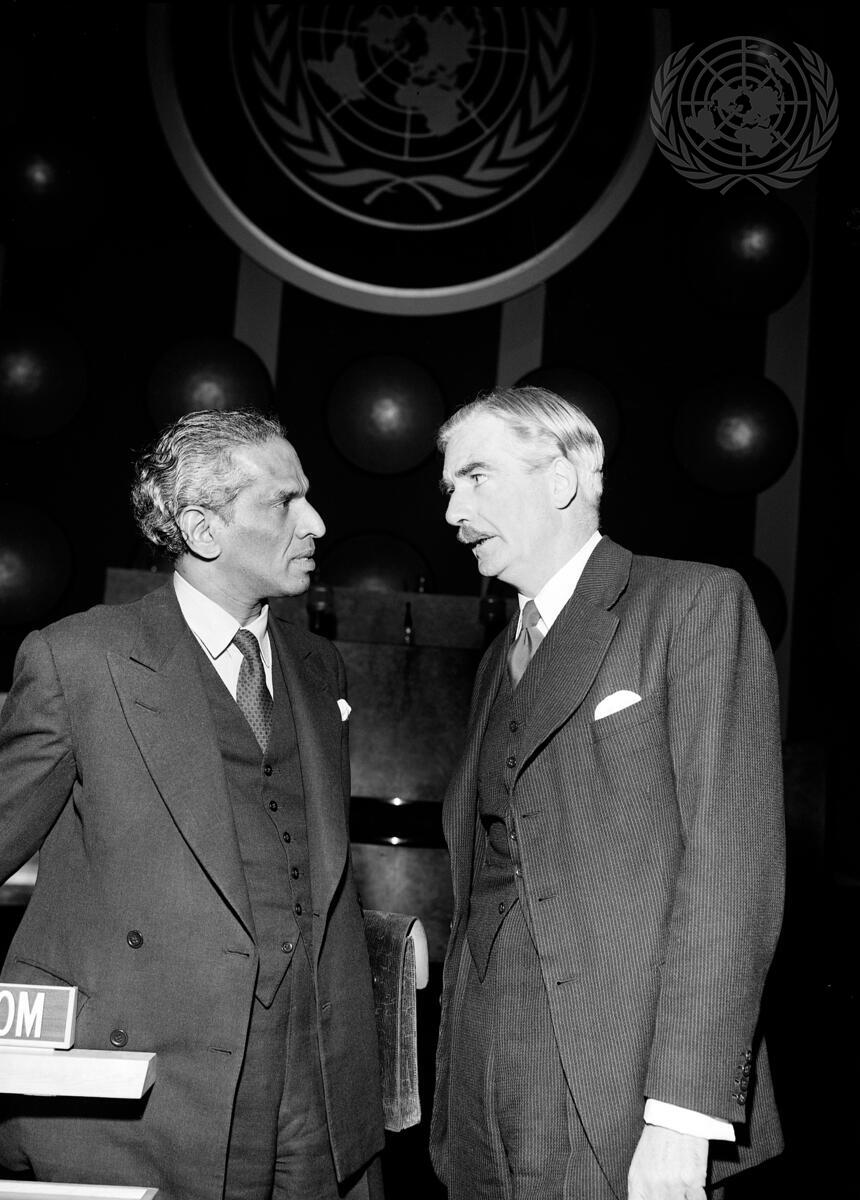 Anthony EDEN (right), Secretary of State for Foreign Affairs of the United Kingdom, conversing with V.K. Krishna MENON of India, in the plenary hall of the General Assembly building, before the opening of the plenary meeting of 11 March 1953.
