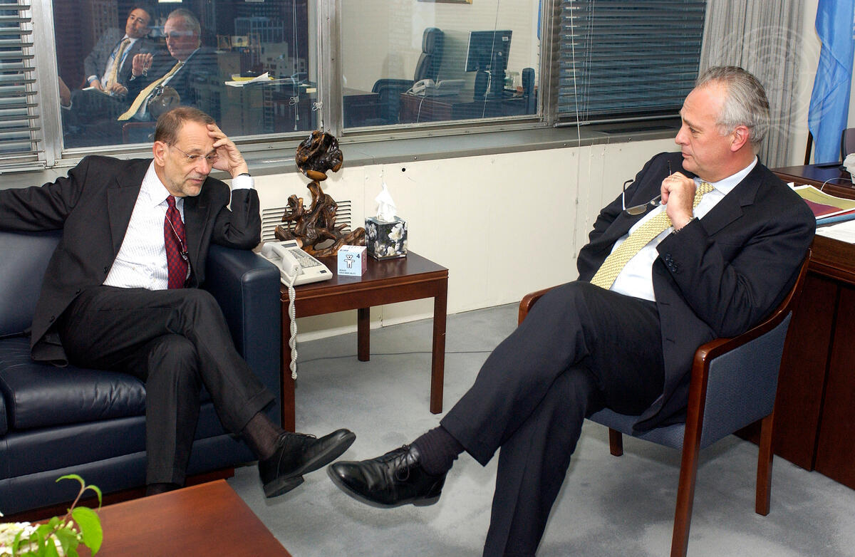 Deputy Secretary-General Mark Malloch Brown (right) meets with Javier Solana, High Representative for the Common Foreign and Security Policy of the European Union, at UN Headquarters in New York.