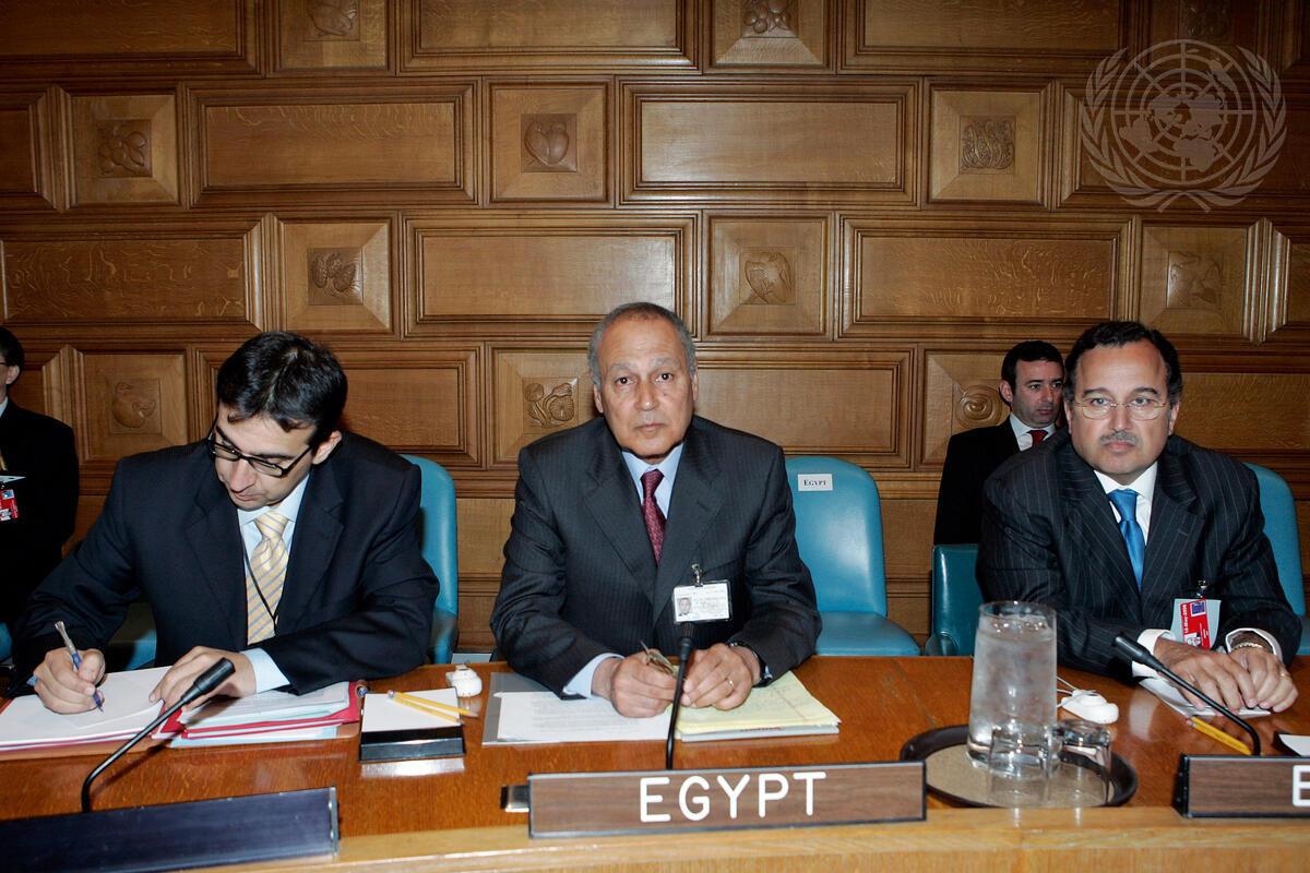 Egyptian Foreign Minister Ahmed Aboul Gheit (centre) leads the Egyptian delegation at the meeting of the Quartet principals from the European Union, the Russian Federation, the United States and the United Nations on the Israeli-Palestinian peace process, today at UN Headquarters in New York.