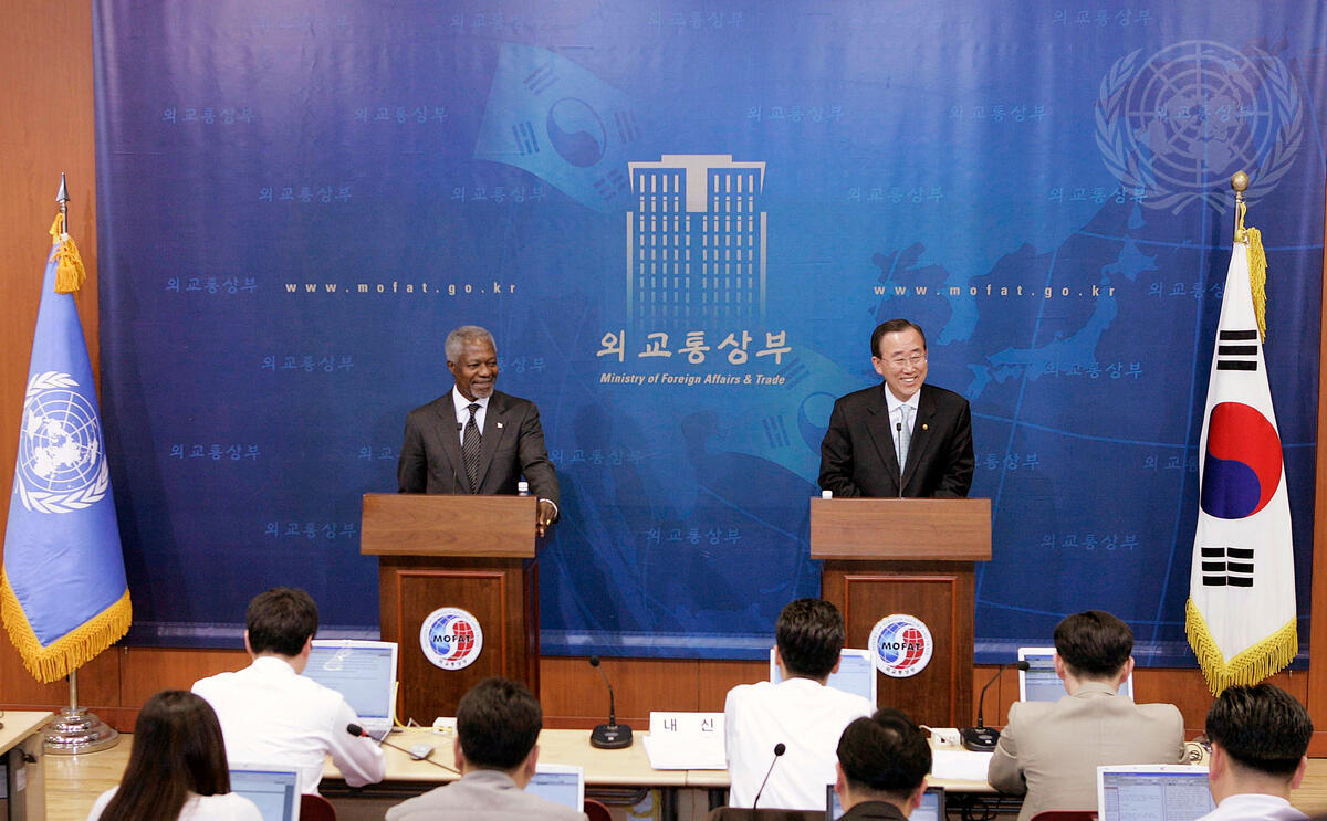 Secretary-General Kofi Annan (left) holds a joint press conference with Ban Ki-moon, Minister of Foreign Affairs and Trade of the Republic of Korea, at the Ministry's Headquarters in Seoul.
