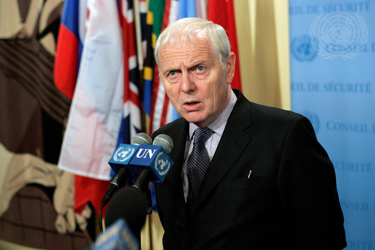 Emyr Jones Parry, Permanent Representative of the United Kingdom to the United Nations, speaks to correspondents at UN Headquarters in New York.