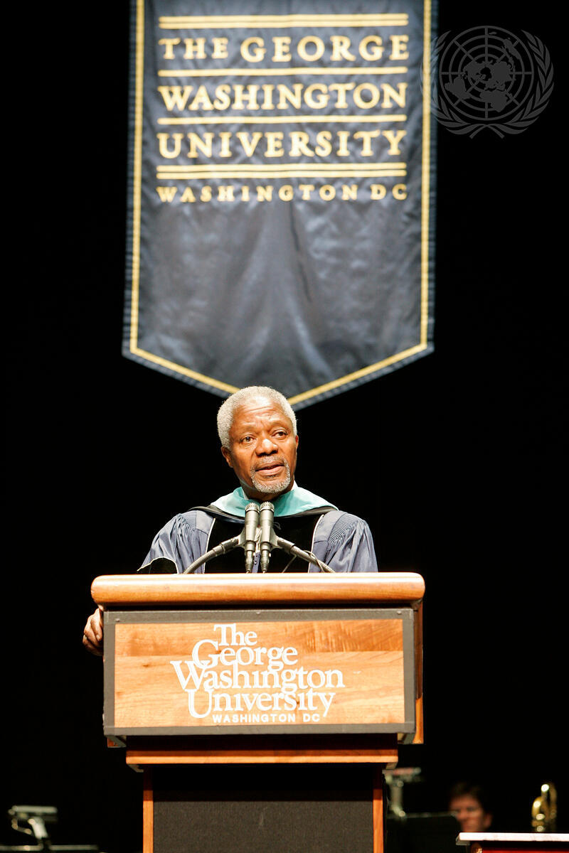 Secretary-General Kofi Annan delivers an address at a convocation ceremony in his honour at the George Washington University in Washington, DC.