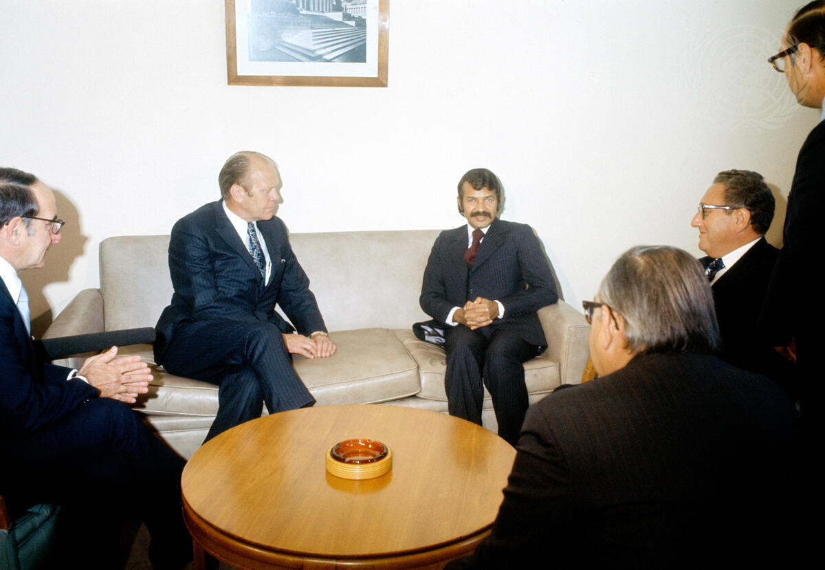 Here, President Ford is seen during his meeting with Assembly President Abdelaziz Bouteflika. At left is Ambassador John Scali, Permanent Representative of the United States to the United Nations. At right is Henry A. Kissinger, Secretary of State of the United States.