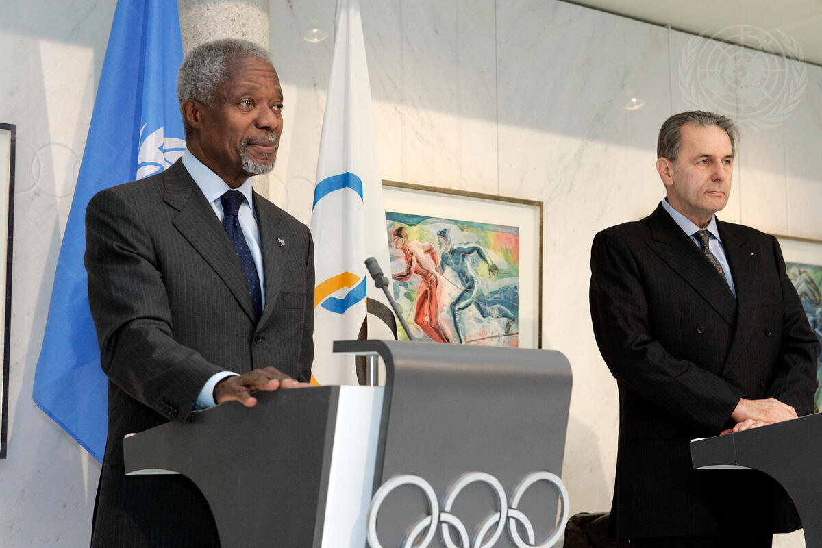 Secretary-General Kofi Annan (left), addresses journalists at joint press conference he held with Jacques Rogge (right), President of the International Olympic (IOC), when Mr. Annan visited the OIC Headquarters in Lausanne, Switzerland, today.