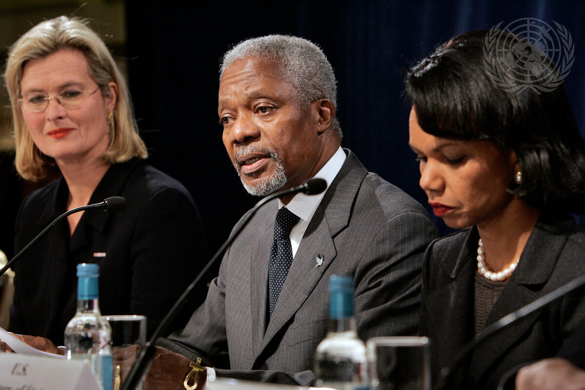 Secretary-General Kofi Annan (centre), flanked by Austrian Foreign Minister Ursula Plassnik (left), and United States Secretary of State Condoleezza Rice, speaks at a joint press conference after the Middle East Quartet Meeting, today in London, United Kingdom.