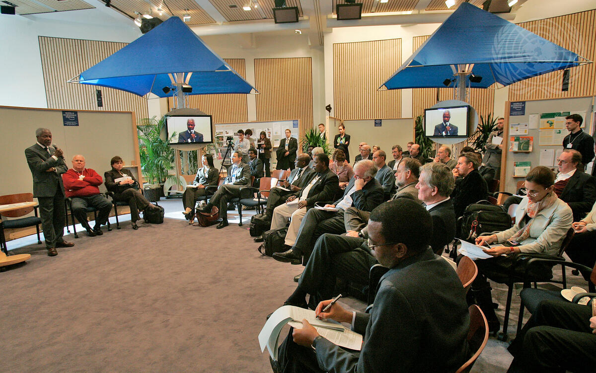 Caption Description Secretary-General Kofi Annan (left, standing) speaks at a workshop on ""Taking Action to End Hunger"" in Davos, Switzerland. Also present are James T. Morris (next to Mr. Annan), Executive Director of the World Food Programme, and Ann M. Veneman, Executive Director of the United Nations Children's Fund (UNICEF).