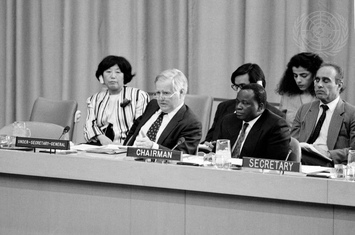 Addressing the meeting is Marrack Goulding (left), Under-Secretary-General for Peacekeeping. On the right is Ambassador Ibrahim A. GAMBARI (Nigeria), Chairman of the Committee.