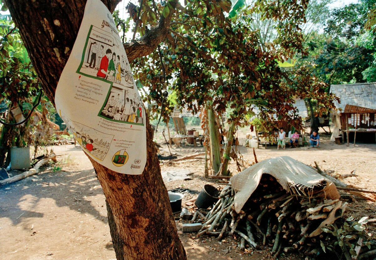 An UNTAC-produced poster tacked onto a tree conveys information about the upcoming elections, scheduled for 23-28 May 1993.